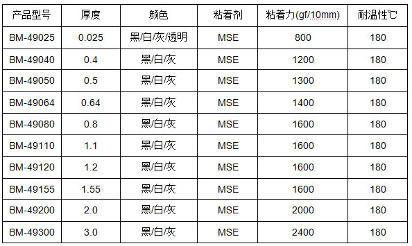 亚克力泡棉基材,双面涂布丙希酸胶制成。具有从0.25mm-3.0mm全系列厚度;有黑色、白色、灰色及无色透明等各种颜色;并有高耐剪切、高初粘性、高耐久性、高耐温性能及低表面张力适用性能搭配;PE及纸质离型纸可选、PE及纸管芯可选等优点。可以替代3M的VHB产品,并具有一定的价格优势,是替代3M材料的理想产品。VHB亚克力胶带,具有防水、防振动、耐热、隔音、粘着力强、耐侯性优,尺寸稳定性好、冲切性能优,对塑料、金属、木材、纸张和有机硅、塑料等都具有很好的粘合性、剥离强度;抗化学溶剂、抗潮湿初粘高、随形性好、抗紫外线。