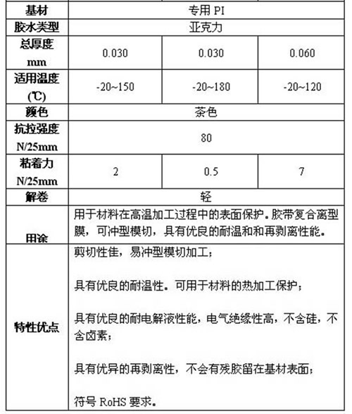 以聚酰亚胺薄膜为基材,涂覆专用低粘压亚克力胶水,专用于锂电池化成时的保护。具有耐高温,不残胶,对电池表面无污染的特点。