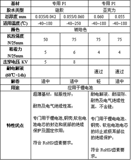 以聚酰亚胺薄膜为基材,涂覆专用胶水,专门用于锂/镍/镉等各类铝壳、钢壳、软包电池电芯的极耳部位的绝缘保护。适用于圆柱形,方形等各种锂电芯极耳。